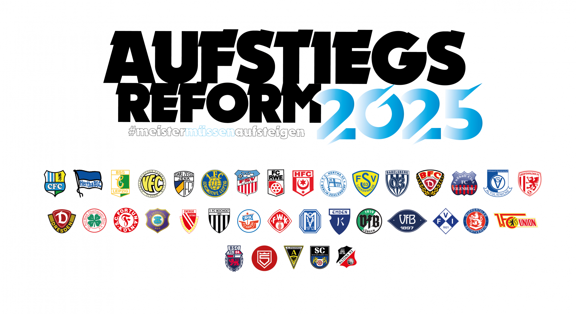 Die Initiative „Aufstiegsreform 2025“ wurde am 12. Februar 2025 in Chemnitz ins Leben gerufen. Sie setzt sich für eine verbindliche, faire und transparente Aufstiegsregelung aus allen fünf Regionalligen in die 3. Liga ein. Aktuell dürfen nur drei der fünf Meister direkt aufsteigen – jährlich rotierend müssen die Meister aus dem Norden, Nordosten und Bayern in einer Relegation gegeneinander antreten. Dabei bleibt ein Meister am Ende auf der Strecke. Dieses System ist einzigartig ungerecht im deutschen Ligensystem und wird von der Initiative als nicht länger tragbar angesehen.