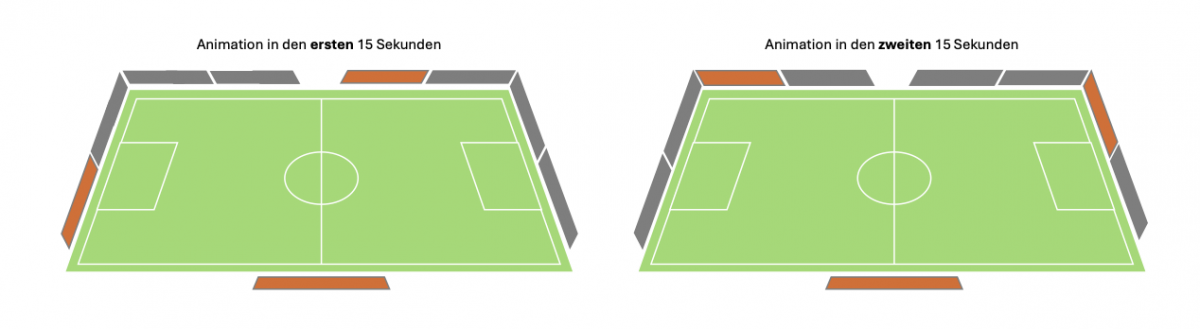 - 30 Sekunden statische Werbung auf zweimal 27,20 Metern LED-Fläche – prominent platziert hinter dem Tor und an der Längsseite.
